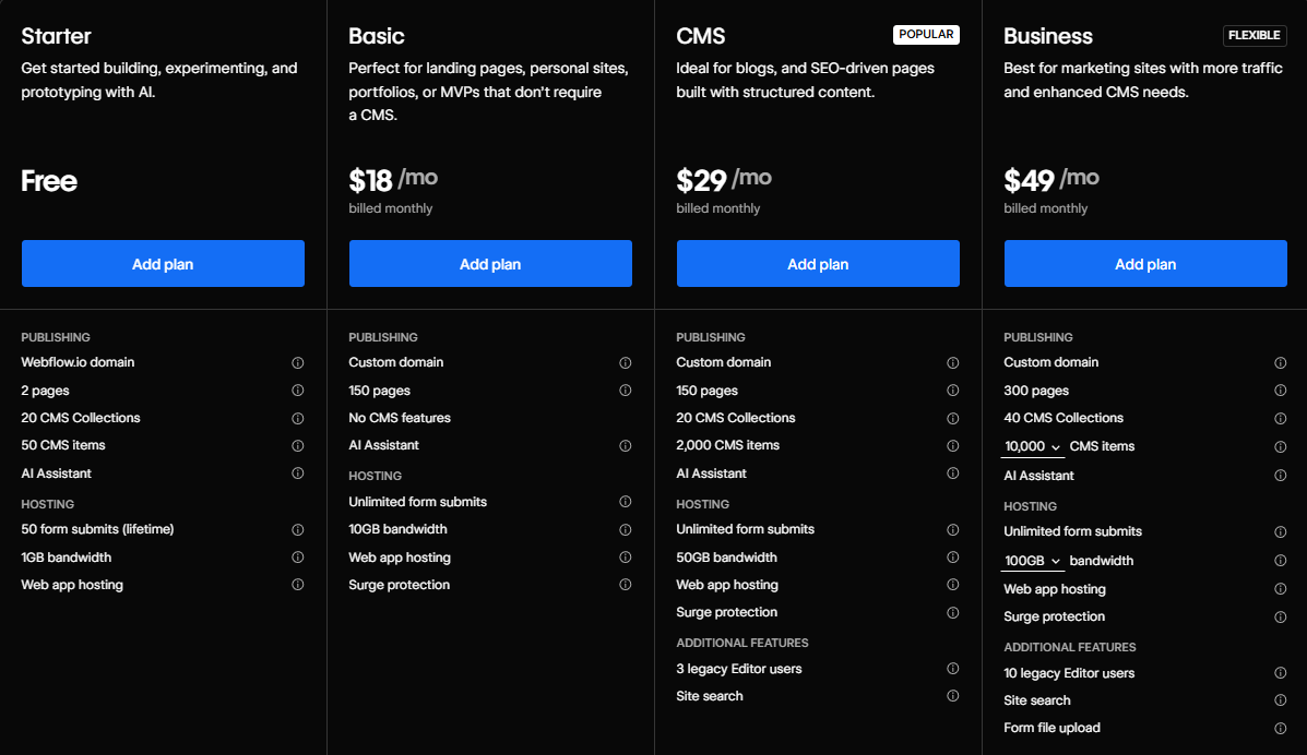Webflow bietet derzeit vier Site-Pläne – Starter, Basic, CMS und Business – sowie eine Enterprise-Option für besonders große Projekte.