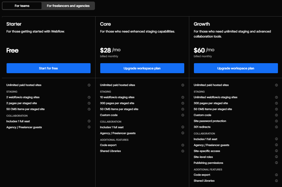 - Starter (kostenlos) – Perfekt, um Webflow im Team auszuprobieren.